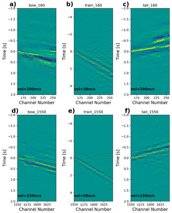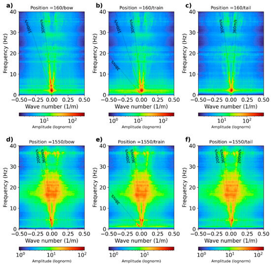 A more in-depth analysis is performed by computing the frequency–wavenumber spectrum for selected dark fiber-optic records. We display the frequency–wavenumber or f-k spectrum for two selected positions at 160 (channels 160–260) and 1550 (channels 1550–1650) (Figure 7). We display the f-k spectrum for bow (Figure 7a,d), train (Figure 7b,e), and tail (Figure 7c,f) signals. The f-k spectrum was computed using at least 60 train passages.