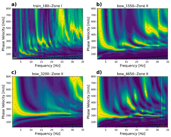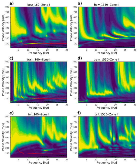 The phase velocity spectra for Zone II are displayed in Figure 9b,d,f. Figure 9b shows the dispersion trends of the bow waves. These appear much clearer compared with the ones retrieved from Zone I. The measured phase velocity of the interpreted fundamental mode varies from 170 m/s to 300 m/s in a frequency range between 4 and 20 Hz. There is also the presence of two clear higher modes, which propagate in a velocity range between 200 and 300 m/s up to a frequency of 30 Hz. Figure 9d,f show the phase velocity spectrum computed for the train and tail waves, respectively. Although both wave types show some multimodal patterns in a similar velocity range, with respect to bow waves, they are not well separated and, thus, difficult to interpret. This consistent behavior was observed in all segments analyzed along Zone II, indicating that, for this zone, the best results are obtained for bow waves or when a train is approaching.
