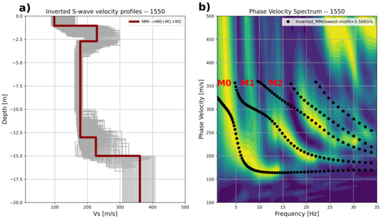 The inverted profiles for position 1550 are shown in Figure 12a. The forward response of the best inverted S-wave velocity profile (dark red line in Figure 12a) is plotted together with the