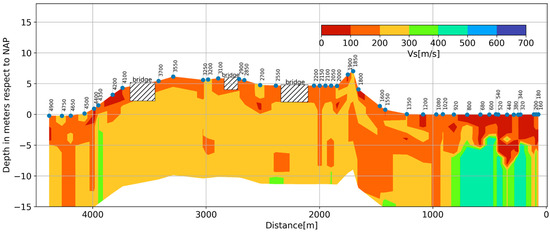 Once all 1D S-wave velocity profiles are computed, they can be interpolated to describe the stiffness variation in terms of S-wave velocity (Figure 13). It appears that most of the variability occurs in Zone I (segments 160–1020), which is characterized by the soft–thick (clay and peat) layer that varies between 80 m/s and 110 m/s, overlaying a relatively stiff layer (sand) with an S-wave velocity of about ~400 m/s. The traditional geotechnical survey data were checked, and indeed, after channel 920, the properties of the deep layer changed.
