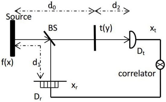 Our GI scheme is depicted in Figure 1; it can be observed that it is identical to the standard GI system. The classical stochastic optical field is split into two beams via the nonpolarized beam splitter (BS); these two beams propagate through the reference and test paths. The test path contains an unknown object and a point detector , with representing the distance from the object to the test detector and representing the distance from the source to the object. The reference path is unrelated to the object and includes a high-resolution detector , with the distance between the source and the detector denoted as . A correlator correlates the intensity distributions recorded by and to obtain the GI patterns.