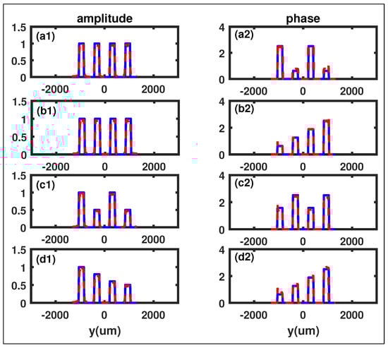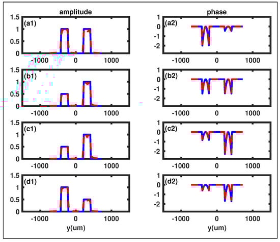 The retrieved phases and amplitudes of the four different four-slits. The solid blue curves represent the initial phases and amplitudes, while the dashed red curves display the reconstructed phases and amplitudes. (a1,a2): The original amplitude and phase of the first four-slit, with parameters , , . (b1,b2): The original amplitude and phase of the second four-slit, with parameters , , . (c1,c2): The original amplitude and phase of the third four-slit, with parameters , , . (d1,d2): The original amplitude and phase of the fourth four-slit, with parameters , , .