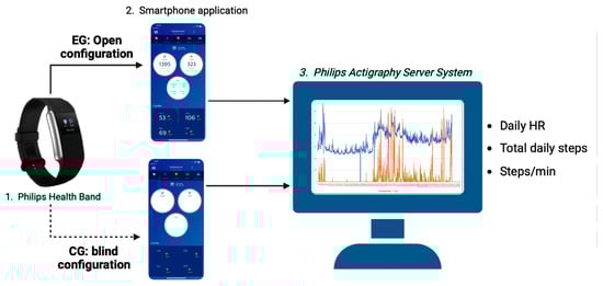 The protocol had a duration of 18 weeks, divided into a two-week observational period (W0–W2), aimed at collecting useful data to set up the 16-week AP protocol (W3–W18). During W0–W2, participants were monitored daily using a health band (Health Band, Philips Respironics, Pittsburgh, PA, USA) to record steps, activity time, walked distance, HR, and energy expenditure through an actigraphy and heart rate device. The health band provided health data tracking via Bluetooth technology to a mobile application installed on the participants’ smartphones, which were connected to the Philips Actigraphy Server System (PASS) website to monitor the participants’ data. At the end of W2, participants were randomized in a 1:1 ratio to either the experimental (EG) or control group (CG). In both groups, participants used the health band and mobile application; however, the EG participants could monitor exercise intensity and physical activity execution during the training session and received feedback of their training data through the app, whereas the CG participants trained with a blind configuration of the health band and mobile application and received no data feedback. The training data were also automatically downloaded from all participants to the PASS website to be monitored by the study coaches.