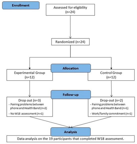 Initially, we were able to start the program with only subjects who used smartphones with the iOS system (n = 6) because the devices using Android seemed not to support the app and therefore pair with the Health Band. The subsequent release of an app update (March 2022) enabled pairing for the 15 participants using the Android system. However, in three cases, the participant’s smartphone did not support the update. Finally, 21 out of 24 participants were able to download the app on their smartphones.