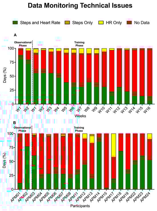 Summary of the information retrieved from the PASS system, including the proportion of days with information on the number of steps and/or HR for all 19 participants according to study week (A) and throughout the whole study period for each participant (B).