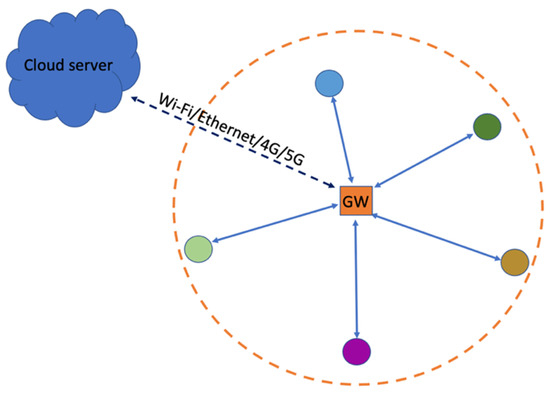 GWs have access to a power outlet and the Internet; hence, they can be used as central devices with more sophisticated system operations to serve and simplify the WAN sensors. In this paper, a star network topology is assumed, as depicted in Figure 1, where IoT sensors are represented by different colored circles connecting to the GW [1]. Having a multi-hop mesh topology is not recommended due to the already low bit-rates available in each link. Coverage issues are overcome by GW diversity instead [2]. With GW diversity provided by the network operator, sensors can access cloud services via the closest neighbor’s GW or via the user’s own GW. ENs serve as sensors for various IoT applications and are typically battery operated. These applications can include motion sensing, smart lock and contact sensing, geo-fencing, smart metering, temperature sensing, asset/pet tracking, and any other IoT applications, as illustrated in Figure 2. All GWs can connect to the same cloud server, where the reach of each GW can be extended to the scale of a WAN. Since the WAN operates in an unlicensed frequency spectrum, it needs to coexist among other WANs, as illustrated in Figure 2. Each of the star networks, depicted by an orange circle centered on its GW, functions autonomously without any dependence on other star networks. Each GW can access to the same cloud server. For such a network, further system optimizations among the GWs can be performed centrally via the cloud server. With narrow-band connectivity hardware suitable for low-bitrate IoT applications, the coverage area of each GW can span to few hundred meters, causing interference to the neighboring GWs. Hence, it is important to understand the system performance within such an interference prone environment.