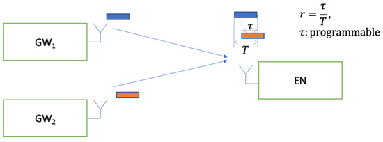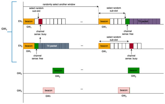 The LBT mechanism is used for Uplink (UL) transmissions by the ENs to avoid interfering with each other and with the other beacons of neighboring GWs. This improves the performance significantly [1,2,3,4,5,6,7,8,9,10,11]. Nonetheless, in the Downlink (DL), GWs do not employ the LBT mechanism. Instead, GWs are required to periodically transmit their high-priority beacons, sending one beacon at each beacon interval. Ensuring this procedure is essential to prevent ENs from losing synchronization with the desired GW, which could lead to network disconnection, particularly when consecutive beacon signal losses occur. This study primarily examines the performance of beacon collisions between multiple GWs and their success rates as received by ENs.