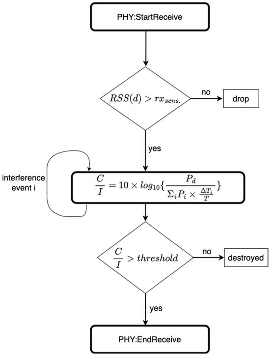 The collision and interference model in the simulator considers all these parameters before a packet can be marked as successfully received or dropped. A packet drop can be caused by unfavorable conditions such as large interference or path-loss. This is illustrated in Figure 5. The term represents the receiver sensitivity in dBm. For the packets to be considered as successfully received, the RSS of the desired signal at distance from the transmitter needs to be greater than the receiver sensitivity, i.e., Furthermore, once this condition is satisfied, the C/I needs to be above a threshold in order for the packet to be received successfully. This threshold depends on the selected MCS in the communication link. Let represent this threshold in dB. The higher-bitrate MCSs require a larger threshold and larger sensitivity. These thresholds will be presented in detail in Section 3, assuming that GFSK modulation is used for the MCS.