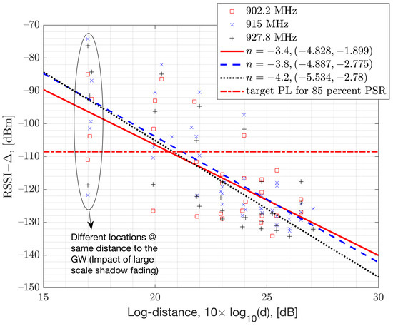 In this section, the path loss model is presented for the US 902–928 MHz ISM band in an outdoor urban area. The path-loss (in dB) is defined as the total propagation loss between the transmitter and the receiver and can be defined as:, where the term in dBm represents the received signal strength at a distance, [m]. The term [dBm] represents the transmitted power at the transmitter. The term Received Signal Strength Indicator (RSSI) [dBm] represents the estimate of RSS, as reported by the receiver. Additional insertion losses in [dB] due to analog RF hardware losses can be added to this formula, depending on where the refers to. This is relevant if the RSS is reported for the antenna port of the receiver, whereas the signal is processed at the chipset port. The path loss depends on various factors such as the channel frequency, distance between the transmitter and receiver, and random shadow fading variations caused by the environment [20,21,22,23,24,25,26,27,28,29]. In most of the models published to date, the path loss can be modeled as follows:
