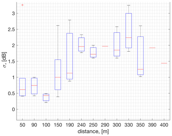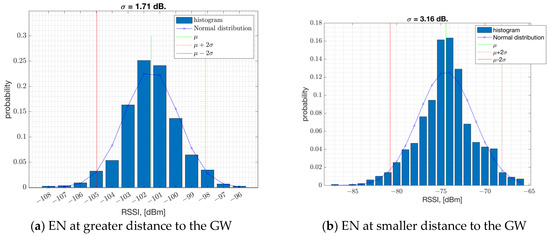 The field measurements taken in an urban area such as Westchester, LA, show that the shadow fading standard deviation is estimated to be = 1.4 dB averaged across locations (ref. Figure 7). This estimate is based on measurements within 400 m to the GW, where the RSSI is represented in full range to cover the PSR of 100% down to 0%. In Figure 7, on each box, the central red line indicates the median, and the bottom and top edges of the box indicate the 25th and 75th percentiles of the measurements, respectively. The whiskers extend to the most extreme data points not considered as outliers, and the outliers are plotted individually using the ‘+’ symbol. Figure 8 illustrates the probability mass function of the RSSI samples collected at two distinct positions (depicted in Figure 8a,b). In the plot, the terms and represent the mean and standard deviation of the RSSI samples, respectively. The results suggest that both the average RSSI value and its standard deviation are impacted by factors such as location, environment, and proximity to the GW.