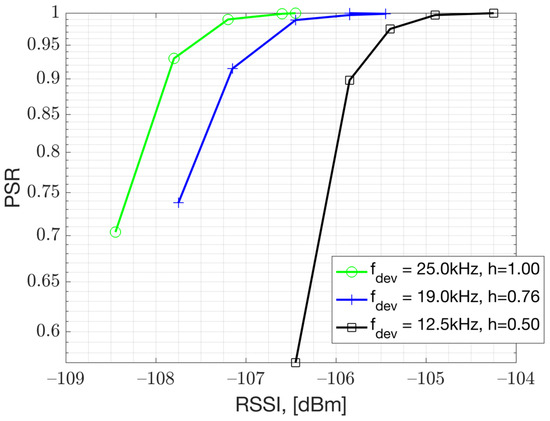 Based on the conducted PSR versus RSS measurements presented in Figure 9, it is recommended to keep the modulation index at for GFSK 50 kbps implementation. The PSR results, as shown in Figure 9, indicate that achieves a better performance than and This makes sense, as a larger frequency deviation results in more separation among the soft FSK bits which are under a White Gaussian Noise (AWGN). This is especially crucial for very low bit-rate IoT applications that use very small frequency deviations. These results were obtained using the Texas Instruments Evaluation Board (TI-EVB), supporting GFSK 50 kbps modulation. The testing involved a setup where the Rx signal power input to the EVB was varied. Essentially, this result presents the performance under thermal noise and corresponds to AWGN performance.