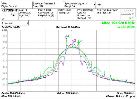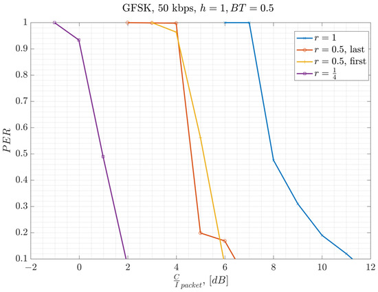 In this section, the measured performance of the GFSK 50 kbps PSR under co-channel interference is presented. The results are measured with the overlap ratios of r = 1 for baselining, with r = 0.5, and r = 0.25 for comparison. The system setup presented in Figure 13 is used for the conducted measurements, where there is one interfering user for link-level system characterization. The term represents the duration of the overlapping section of the interferer over the desired packet, where represents the overlap ratio presented in Equation (1). The measurements are conducted for different values of and, hence, different values of .