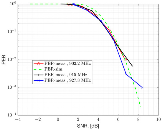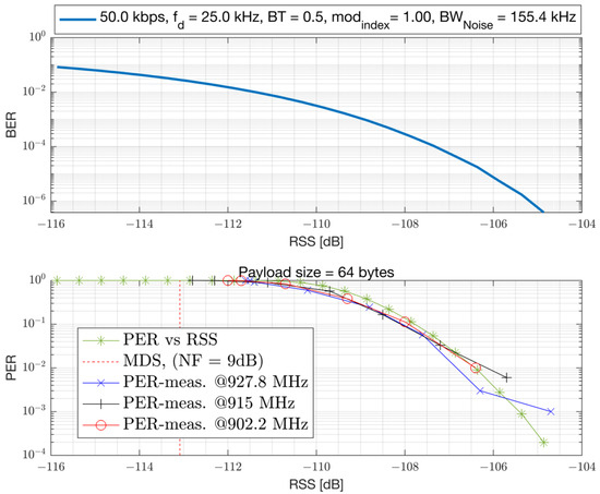 where the term represents the Noise Figure (NF) of the device for thermal noise and other noise sources. The chipset under characterization is a TI-EVB and has a 9 dB NF. The PER versus the Signal to Noise Ratio (SNR) and RSS is presented in Figure 11 and Figure 12, respectively. Both the simulation results assuming AWGN channel and conducted lab measurements are presented. The results are obtained with an un-coded baseband, which does not employ Forward Error Correction (FEC). FEC can improve sensitivity at the cost of reduced bit-rate. The Rx filter bandwidth of the device is set to 155.4 kHz for the 50 kbps GFSK mode with the recommended modulation index of 1 and a Gaussian filter coefficient of BT = 0.5. The Rx filter bandwidth is set to a value larger than the modulation bandwidth (50 kHz) to accommodate CFO impairment that can vary across process, voltage, temperature, and frequency (PVTF). However, a larger Rx filter bandwidth passes more thermal noise and causes a degradation in Rx sensitivity, but simplifies the hardware. A modulation index of 1 is selected for such a narrowband modulation to improve robustness to RF impairments such as CFO. The receiver sensitivity of the device can be related to the level required to achieve a bit error rate of . This corresponds to an un-coded PER of 1% with a 64-bytes payload. From the results, it can be seen that this device can achieve an un-coded sensitivity of −107 dBm (at 155.4 kHz Rx bandwidth) and requires an SNR of 6 dB with 9 dB NF. The simulation results presented in the AWGN channel are compared with the conducted laboratory measurements, demonstrating a strong agreement.