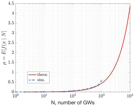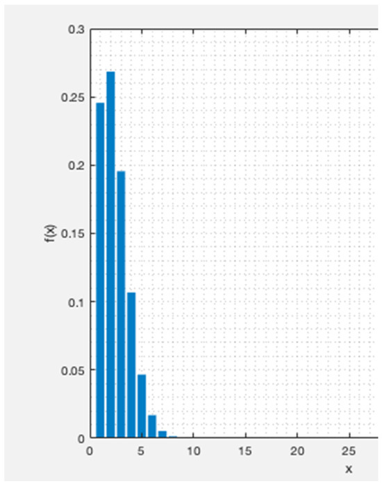 For instance, the PMF with N = 5000 GWs, denoted as is illustrated versus x in Figure 15 for the DL. This plot depicts the distribution of beacon collision probability. The parameters considered for this result are = 152 ms, , and . With these assumptions, the mean number of collisions is .