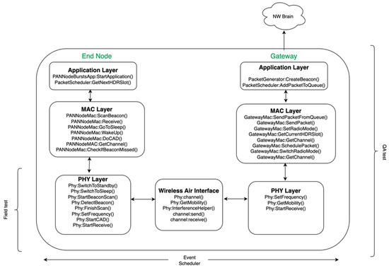 In this section, the simulator architecture is introduced. The simulator is developed to generate the numerical results presented in Section 6. The Network Simulator-3 (NS-3) is utilized based on the NS-3.33 version. NS-3 is a discrete-event-based network simulator that operates based on a series of events created by a specific network topology [33]. New classes and methods are implemented to create the WAN IoT simulator along with the specific PHY model, as presented in Section 3. Modifications are applied to the simulator to incorporate the PHY and MAC layer models presented in Section 2. The classes created for each layer of the protocol stack are depicted in Figure 16. The application layer manages the events for packet generation and schedules them down to the MAC layer. The MAC layer at the GW is responsible for beacon creation, frequency hopping, and switching among various radio modes. The MAC layer at the EN is responsible for scanning for beacons, receiving a beacon, or a data packet coming from the GW in the DL, and setting the channel, etc. The event scheduler manages the MAC and PHY layers, i.e., it manages switching among various radio modes such as sleep, wake-up, standby, CAD, active RX, and active TX, etc. The PHY layers at the EN and GW are interconnected via the wireless channel, i.e., the wireless air interface. The wireless air interface computes the distances between the GWs and ENs and determines the corresponding RSSs. The C/I ratio per link at a given time is calculated using the interference helper function. This function calculates the air times per packet and determines all the overlapping collision events over which the C/I value is determined as described in Section 2. The PSR is determined based on the C/I and RSS levels experienced by each packet. The PSR is calculated as the ratio of the total number of packets successfully received versus the total number of packets sent.