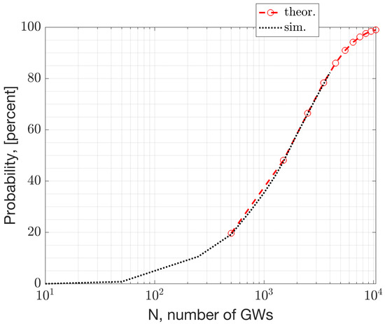 The PMF plot in Figure 15 above serves as an illustrative example, revealing that, with GWs, the likelihood of and devices colliding is around 0.25 and 0.27, respectively. In contrast, the probability of more than 10 devices colliding simultaneously is 0, as determined by the PMF described in Equation (6).
