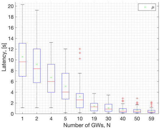 Statistics for beacon acquisition latency, derived from Monte Carlo simulations using the NS-3 model, are depicted in Figure 19. On each box in the figure, the central red line indicates the median, and the bottom and top edges of the box indicate the 25th and 75th percentiles of the samples obtained from the simulation results, respectively. The samples, i.e., the data points marked with + symbols in this plot represent outliers within the dataset. Outliers are observations that deviate significantly from the overall pattern of the data. The green ‘x‘ symbols on the data points represent the dataset’s mean values obtained through simulations for a specified number of GWs. Opting for a longer beacon interval, such as 10.08 s, results in a mean beacon acquisition latency of approximately 10.6 s when 50 ENs are attempting to discover a single GW. Conversely, beacon acquisition latency diminishes exponentially with an increasing number of GWs available to serve the WAN in the neighborhood. Thus, choosing an extended beacon interval, along with a frequency-hopping system featuring multiple channels, proves to be a favorable option for a narrow band WAN, especially in scenarios where multiple GWs can serve the ENs.