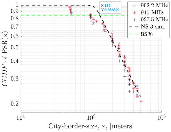 In Figure 20, the Complimentary Cumulative Distribution (CCDF) illustrates field measurements for PSR in relation to the distance from the nearest GW, using 50 kbps GFSK modulation. Within this graph, the 85th percentile of the PSR, denoted as TP-85, is highlighted. Observations from various locations indicate that a coverage range of approximately 130 m can be attained with . In other words, the TP-85 distance covered is 130 m with PSR values greater than or equal to 85%. These measurements were conducted in Westchester, Los Angeles, an urban area. Multiple measurements were taken at various locations equidistant from the GW to showcase the statistics and impact of interference in a real-life scenario. The results are compared to the NS-3 simulation outcomes, where a fixed additional loss is presumed for the environmental interference. The NS3 model sets the path loss exponent to the mean value predicted by experimental results, while in the field, variations in the terrain and buildings can lead to differences in the measurement outcomes. The field measurements show that a CCDF equal to 1 (100% PSR) is not commonly observed due to non-zero interference, even when in the vicinity of the GW.