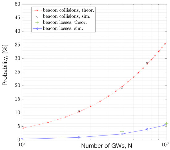 The loss of a beacon causes an increased latency to resynchronize and might result in the falling out of the network; hence, beacon collision probability is investigated in detail in this section. Each beacon must be transmitted periodically; hence, GWs do not employ the LBT mechanism, which does not help in collision avoidance.