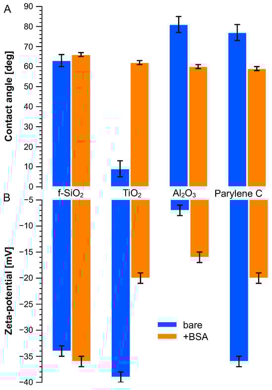 (A) Water contact angle and (B) surface zeta potential measured on bare surface (blue bars) and BSA-treated (orange bars) surfaces.