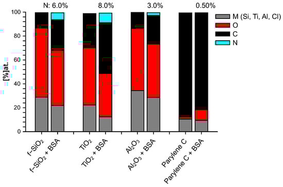 The elemental composition of both bare and BSA-conditioned surfaces was determined by XPS: atomic ratios (%) are presented in Figure 3. It has to be mentioned again that the bare surfaces were analyzed after 10 mn immersion in water only. These bare surfaces exhibit a stoichiometric ratio of their constitutive elements with a few percent of residual carbon/oxygen contamination: , being a particularly reactive surface, presents the highest level of superficial contamination. No significant nitrogen was detected on these bare surfaces. Since BSA molecule is the only source of nitrogen, the additional proportion of nitrogen after immersion in BSA solution is a good indicator to track the quantity of BSA molecule adsorbed on the surface and therefore to investigate the protein adhesion ability of these surfaces. From this criterion, it can be concluded that after 10 mn immersion in BSA solution, the most important BSA adsorption occurs on titanium dioxide, followed by fused silica, aluminum oxide, and finally very poorly on parylene C. Nevertheless, the parylene C surface was modified by a significant enrichment in oxygen that was not observed after 10 min in water alone and could thus come from adsorption of the altered BSA. By “altered BSA”, we mean adsorption of BSA that is oxygen-richer than expected. This may be due to further adsorption of hydroxyl groups that is favored by the presence of BSA since this trend is not observed when bare parylene C is immersed in water.