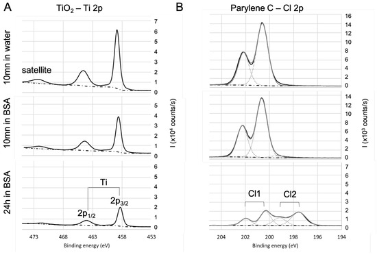 The spectra of Ti2p core level (see Figure 4A) for samples are in agreement with the literature [77]: they exhibit a 5.7 ev spin-orbit split, a satellite structure around 472.3 eV, and is located at 458.3 eV. The area ratio is 2:1. There is no significant evolution of this signature with the immersion in BSA solution except for the decrease in the intensity of the titanium signal. This decrease is due to the BSA adsorption on that lowers the contribution of the in the detected signal. As the bond already exists on the bare surface, it is difficult to conclude on the existence of a bond between titanium and oxygen from BSA. The results (not shown here) are similar in the case of the Si2p and Al2p for respectively fused silica and alumina except for the fact that and are in the same envelope because the spin-orbit split is smaller. In the case of parylene C (see Figure 4B), Cl of the bare sample is located at 200 eV, which is consistent with chlorine in the organic compounds, with a 1.6 eV spin-orbit split and a 2:1 area ratio of . After 24 h immersion in BSA, Cl 2p exhibits another contribution (Cl2, with the same split and surface ratio as Cl1) at lower binding energy (197.6 eV for ), which can be attributed to BSA adsorption with a bond that is likely to be formed between chlorine and BSA amine group.