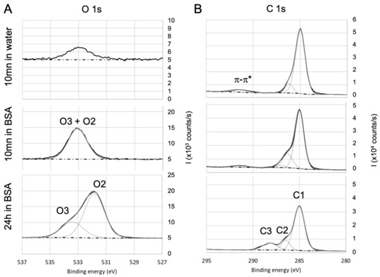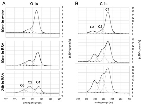 For parylene C, the O1s core level high-resolution spectra (Figure 6A) exhibit only O2 and O3 contributions after 24 h immersion in BSA, confirming the presence of adsorbed BSA. O2 and O3 also exist after 10 min immersion in BSA, but are less marked. On the carbon spectra (Figure 6B), C1 also includes aromatic and . The component at 291.5 eV is attributed to the satellite structure induced by excitations on the aromatic ring [80]. After 10 mn immersion in BSA, C2 is increased compared to the bare surface and can be correlated to the increase in oxygen O2 + O3. Therefore, it can be concluded that after 10 min immersion in BSA, the surface of parylene C is enriched in oxygen: this may be due to adsorption of altered BSA due to adsorption of both BSA and hydroxyl groups as (i) the amount of adsorbed nitrogen does not match with stoichiometric BSA, (ii) C3 is too small to confirm peptide bonds and (iii) the O2+O3 contribution was lower after 10 min immersion in water alone. After 24 h immersion, the amount C2 and C3 are in agreement with O2 and O3.