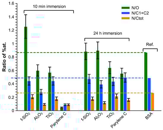 The composition of the adsorbed layer was finally investigated in terms of N/O, N/(C1 + C2) and N/C ratios and compared to BSA stoichiometric composition [81]. The contribution of the bare substrate was subtracted from the global quantitative analysis, considering that the composition of the substrate was stoichiometric: the evaluation of this contribution was deduced from the amount of the heteroatom. The results are presented in Figure 8. Globally, whatever the immersion duration, all the adsorbed layers exhibit an excess in the carbon amount. After 10 min immersion, the N/O ratio is higher than the reference on silica fuse and lower on alumina and titanium dioxide. Considering that the N/(C1+C2) ratio matches with the reference for and , this means that the adsorbed layer is oxygen-deficient for and presents an excess in oxygen on . On alumina, the superficial layer is nitrogen-deficient. After 24 h immersion, except for the excess on contamination carbon, the adsorbed superficial layer is rather close to BSA composition on fused silica and alumina whereas it remains too rich in oxygen on parylene C and titanium dioxide.