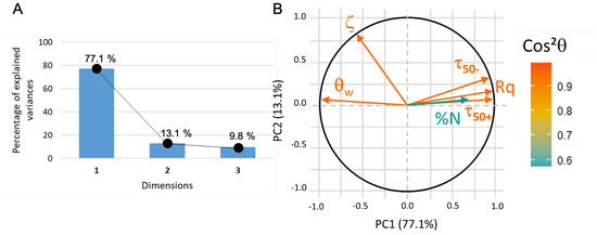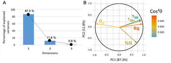 For this first PCA analysis, all the variables are active (as they participate to the PC building). The data are correctly represented (about 90% of the information, see Figure 9A) in a 2D coordinate system where the first principal component (PC1) can be assimilated to roughness, water contact angle, and adhesion of functionalized beads whereas PC2 is correlated to zeta potential (Figure 9B). The nature of PC1 indicates that both roughness and hydrophilicity (i.e., small water contact angle) strongly favor the adhesion of microbeads (whether positively or negatively charged), whereas the potential of substrates appears uncorrelated.