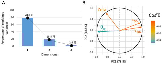 (A) PCA1 variance plot that shows that 90% of the information is described by PC1 and PC2. (B) Loading plot where indicates that only protein adsorption data is not correctly represented.