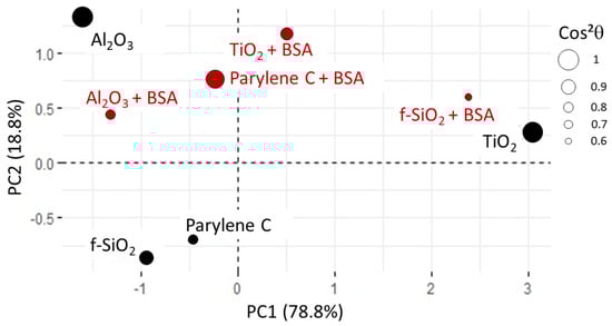 In this new plotting system, the adsorption of BSA is much better represented (Figure 10). It is positively linked to roughness and hydrophilicity, but also depends on another factor, PC2, which remains to be identified. The score plot positions and surfaces along PC1 while parylene C, and are along PC2 (see Figure 11). In other words, considering protein adsorption, alumina and titanium dioxide mainly differ in roughness and hydrophilicity whereas parylene C, and are essentially discriminated by PC2.