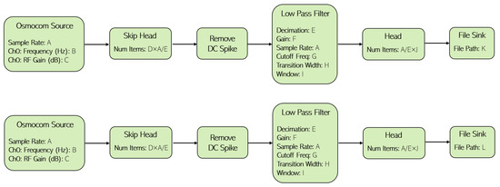 We acquired the data by running a Python script that is generated from the respective GRC flowgraph. A block diagram of the GRC flowgraph is illustrated in Figure 4. A description of the parameters set for the RF sensing system’s offline data acquisition is presented in Table 4.