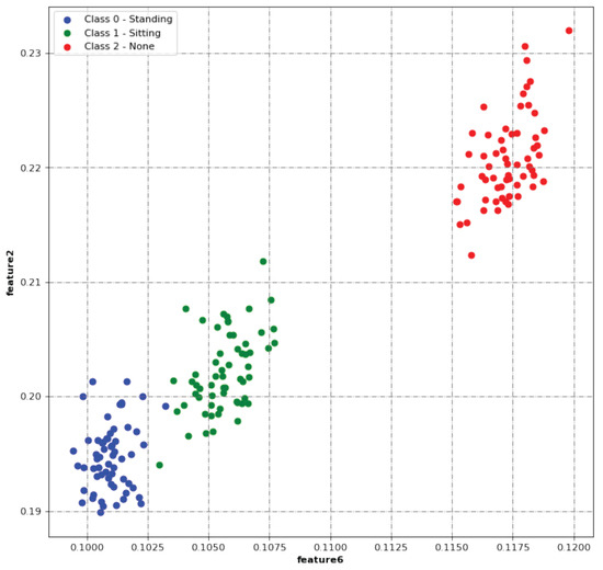 To decrease the overall computation time of the classification process, only 2 of the 15 features were dynamically selected and used in the classification algorithm. It is important to highlight that some features are strongly correlated with others (e.g., Feature1 and Feature9); thus, the selection of such features would not add much information. First, we visually tested different combinations of two features with the datasets in Table 5 by performing a scatter of the two chosen features for each class.
