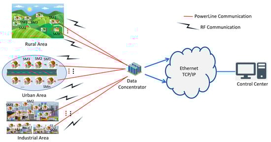 In AMI applications, on the one hand, PLC technology enables communication between SMs and the DC in order to collect accurate and real-time energy consumption data. However, it faces challenges due to electrical noise, interferences from other devices, and varying signal strengths caused by the different lengths and qualities of power lines [48,49]. On the other hand, RF technology enables communication without the need for physical connections or cables, reducing the cost and complexity of installations. Moreover, IEEE 802.15.4g operates over longer distances, making it suitable for large industrial facilities or remote locations. However, it faces challenges in industrial environments, such as signal interference from other devices, multipath signal propagation, and attenuation due to more obstacles being present, such as walls and metal structures [3,50].