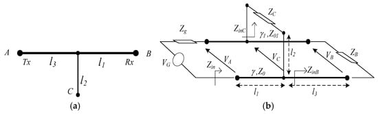 The NB-PLC signals transmitted on power lines are affected by high attenuation due to the propagation of line losses. These depend on the topology of a network, environmental conditions, and behavior of connected appliances, exhibiting variable spectro-temporal characteristics [28]. As a function of loads and of a network’s layout, PLC may induce high attenuation and deep fading effects. The generation of multipath signals is a result of impedance mismatches, which are caused by the presence of many loads connected to a network’s termination points and multiple cable branches. Therefore, the reflected waves yield to multiple delayed echoes in the channel impulse response. In [29], authors develop a delay detection technique for the PLC multipath channel and examine the impact of the electric line length, number of branches, and impedances on the channel path delays. In [30], the authors investigate NB-PLC channel modeling and present a bottom-up approach, namely the voltage ratio approach (VRA), which is based on the topology of a network. A comparison of different NB-PLC models is presented in [31], in which it is demonstrated that the PLC transfer function depends on the network topology and the type of connected loads. Thus, in this paper, the authors opt to apply the VRA model as it accurately computes the transfer function. A single branch is defined in Figure 2a as the combination of three points: A is the transmitting point (Tx), B is the receiving point (Rx), and C is the connected load which comprises another branch. The equivalent representation of a branch in terms of transmission line (TL) parameters is depicted in Figure 2b. In the representation in Figure 2b, l1 denotes the cable length from the Rx end of the path line to the tap point C, l2 denotes the length of the cable connected from the tap point C to the backbone, and l3 represents the cable length from the tap point C to the Tx end of the path line A.