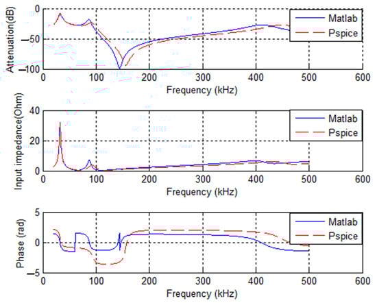 Based on the VRA method, an analytic model for industrial area is developed using Equation (3) and implemented in the R2014a Matlab tool. This model is then compared to the circuit model in Pspice, a CAD tool, for a three-core cable consisting of phase, neutral, and ground branches and when the cable type is assumed to be the same for the three branches. The simulation results obtained from both models are illustrated in Figure 4. The curves for attenuation, impedance, and phase exhibit non-smoothed traces. These irregularities arise due to the presence of discontinuities at various frequencies, resulting in the reflection of propagating waves and power loss.