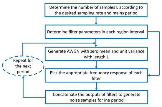 where 1k is the indicator function, is the impulse response of the LTI filter in the interval Ri, and vk obeys the Gaussian distribution. The generation of periodic impulsive noise process is summarized in Figure 6. First of all, the authors determine the number of L samples according to the desired sampling rate and mains period. Then, they determine the parameters of each filter corresponding to each region interval. Afterward, a generation of L-length AWGN with zero mean and unit variance is essential to pick the appropriate frequency response of each filter. Finally, the filters’ outputs are concatenated in order to generate noise samples for one period.