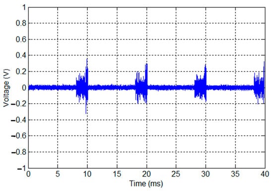 According to [34,35,36], PLC noise may be classified into three types: (1) periodic impulsive noise characterized by its cyclostationarity in both the time and frequency domain; (2) background noise where its power spectral density (PSD) decreases exponentially; and (3) the asynchronous impulsive noise known as random impulses. Since the periodic impulsive noise is the dominant noise component of NB-PLC, authors select it to be the noise model for the power line channel. In this paper, following the IEEE 1901.2 standard, the linear periodical time-varying (LPTV) system models the periodic impulsive noise [37]. Given this model, the noise samples are written as in Equation (6) as follows: