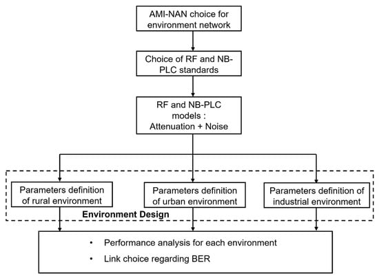 To ensure a reliable link between the SM and DC in a well-defined area, the choice of the communication technology, either RF or NB-PLC, should be based on several parameters. These parameters can be set to evaluate and compare the performance of each technology. Figure 8 presents the proposed methodology to study the environmental impacts of RF and PLC for AMI. The solution design in this paper focuses on the definition of the characteristics of parameters of RF and NB-PLC channels for distinct geographical areas. In fact, the design concerns the distance between the SM and DC, the number of paths for wireless links, the length of the wired link, and the noise model of each link.