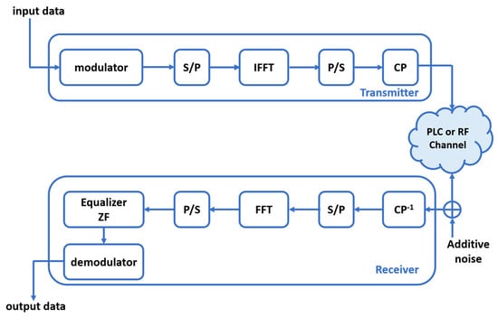 This section deals with a simulation model of the OFDM communication system, as described in Figure 9, regarding RF and NB-PLC links. As depicted in Figure 9, the data are processed using the IFFT algorithm, which converts the time-domain signals into frequency-domain signals. This operation splits the signal into multiple subcarriers which are assigned to specific data symbols. According to the selected standards, pilot symbols are added for channel estimation and equalization purposes. Furthermore, when transmitting data between the SM and DC, an appropriate modulation scheme is crucial. The choice of modulation directly impacts the efficiency and reliability of data transmission. At the receiver side, a zero forcing (ZF) equalizer is used in order to mitigate the effects of channel distortion and interference. The performances of simulated OFDM communication chains are evaluated by computing the BER for each value of the signal-to-noise ratio (SNR), reflecting the accuracy of data transmission and representing the ratio of erroneous bits to the total transmitted bits. All simulations are implemented on Matlab tools.