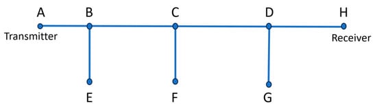 In this paper, the authors choose a topology network with 3 branches between the transmitter A and the receiver H, as shown in Figure 8, where AB, BC, CD, and DH are the lines of the electrical network, whereas E, F, and G are the connected loads whose behaviors are depicted in Figure 10.