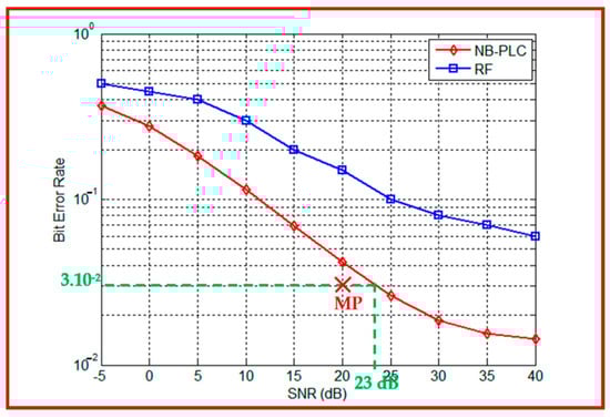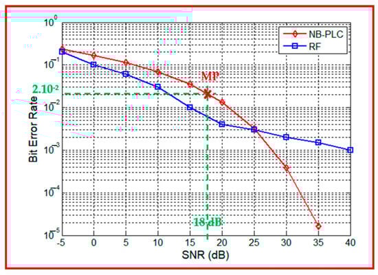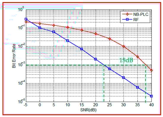 In order to supervise physical equipment, the industrial network represents the most suitable system since it works on studying different interlinked equipment. Figure 14 shows the performance of RF and NB-PLC in terms of the BER. For the RF link, the path number is equal to 40 and the noise is GMM and uses Equation (9), where π1 = 0.99, π2 = 0.01, = 0.001, and = 100. For the NB-PLC link, the length line is equal to 10 m and the noise is cyclostationary impulsive. Dually to the rural case, for the industrial environment to have the same BER value, a lower SNR value is required with NB-PLC if compared to RF.