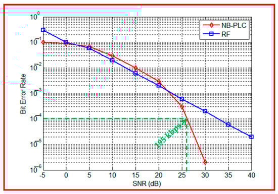 On the other hand, for an SNR greater than 25 dB, the NB-PLC link outperforms that of the RF link, with an approximate 13 dB gap observed for a BER of 10−3. These results demonstrate that despite the low level of noise, the BER of the wireless link does not decrease considerably.
