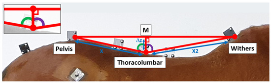 The last step of the calculation used trigonometry to obtain the flexion/extension angle at the level of the thoracolumbar region. The scheme of the method can be found in Figure 3. Computing the mean value between the vertical displacement of the withers and the pelvis, the vertical displacement of the M point was obtained at each instant of time. The Δz distance was then obtained by subtracting the vertical displacement of the M point and the vertical displacement of the thoracolumbar point at the same instant of time. The X and X2 distances were measured by hand using a tape measure on the stationary horse.