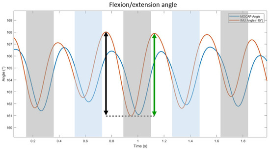 Figure 4. Illustration of the back flexion/extension angles calculated using MOCAP (blue curve) and IMUs (orange curve) on one horse (Horse n° 1) trotting in a straight line. The black arrow indicates the amplitude of extension, and the green arrow indicates the amplitude of flexion. The gray areas represent the left forelimb stance phase, and the blue areas represent the right forelimb stance phase.