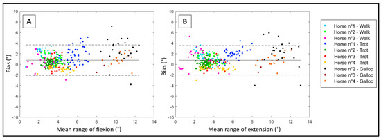 Figure 5. Bland–Altman’s plot (in degrees (°)) of the reference (MOCAP) range of flexion (A) and extension (B) and the range of flexion and extension obtained using the developed method (IMU). One color represents one horse at one gait.
