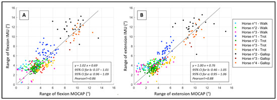 Figure 6. Pearson’s correlation curves between the reference (MOCAP) range of flexion (A) and extension (B) and the range of flexion and extension obtained using the developed method (IMU). One color represents one horse at one gait.