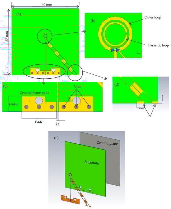 The proposed reconfigurable loop antenna with two PIN diodes and the corresponding biasing network (a) 2D view. (b) outer and parasitic loops. (c) ground plane pads. (d) pads for soldering (e) 3D view.