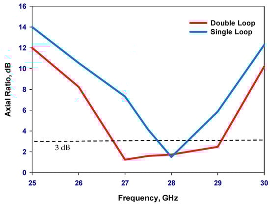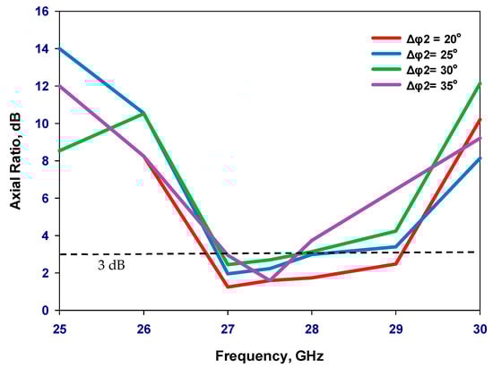 Figure 1 presents the configurations of a reconfigurable antenna designed to operate at 28 GHz. The proposed antenna consists of two concentric loops [,,] in which the outer and inner loops represent the active and parasitic elements, respectively. The proposed antenna is printed on the upper surface of the Rogers RO4003C dielectric substrate, with an equal-sized ground plane positioned beneath the substrate. Besides, the outer loop’s radius needs to be selected so that the circumference is approximately one effective wavelength, . Two gaps have been created on the outer loop to house two PIN diodes that facilitate reconfigurability. The gaps have been optimized to create an optimal traveling wave current distribution along the loop, which is crucial for achieving circular polarization. Figure 2 illustrates the parametric analysis, showcasing the variation in the axial ratio for various values of Δφ2 with the aim of identifying the most favorable angular gap that yields the widest axial ratio bandwidth. As a result, the optimum Δφ2 has been determined as 20°. Besides, Figure 3 presents the simulated axial ratio, comparing two scenarios: with and without the parasitic loop. Upon utilizing the inner loop, the AR ≤ 3 dB bandwidth experiences a notable increase from 2.5% to 8.1%. As anticipated, the parasitic loop significantly enhances the AR bandwidth, given that each loop generates a single AR minimum point. The merging of these two minimum AR points results in the observed bandwidth improvement. The circumference of the outer loop can be calculated as