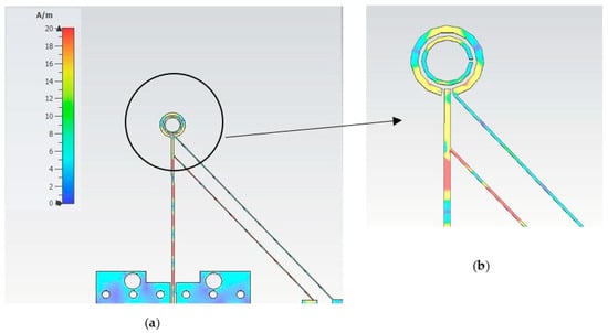 Surface current distribution of the proposed antenna with CPS bias line only at 28 GHz; (a) Whole configuration, (b) View of currents along the loop and adjacent line sections.